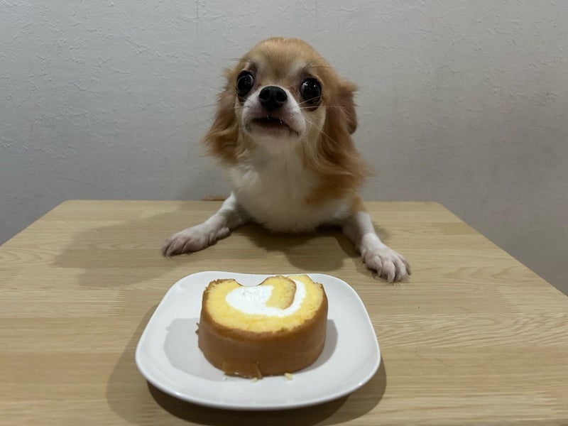 はじめてのケーキ 最初は抵抗を見せたものの、少しペロリとしてからは、美味しいとわかったようで初ケーキを食べました